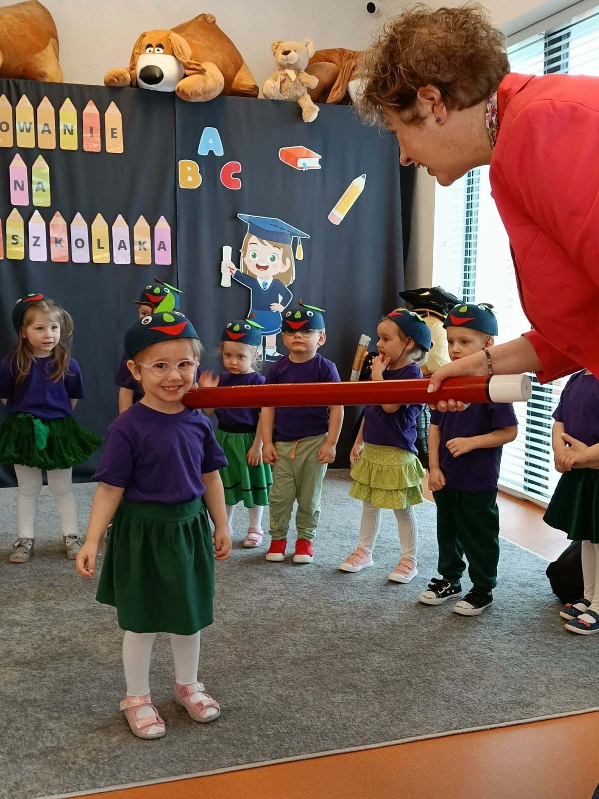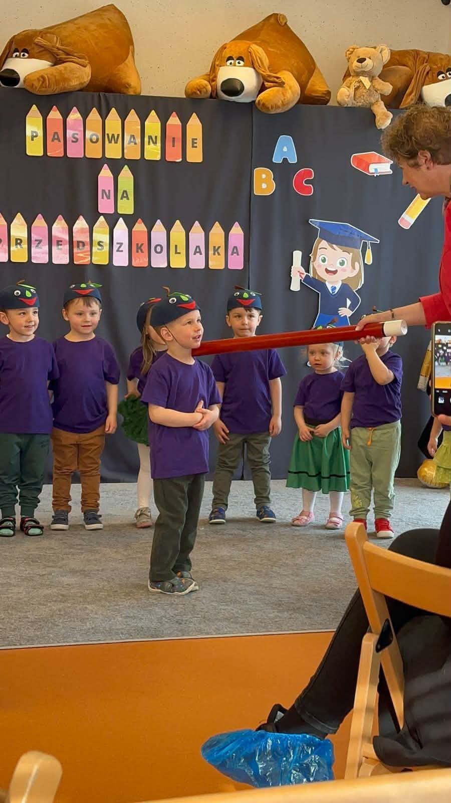 Kulminacyjnym punktem uroczystości był moment pasowania. Pani Dyrektor, za pomocą „czarodziejskiego” ołówka, mianowała każde dziecko na przedszkolaka, a wychowawczynie wręczyły maluchom pamiątkowe prezenty, które wywołały mnóstwo uśmiechów na małych buziach. ✏️🎁