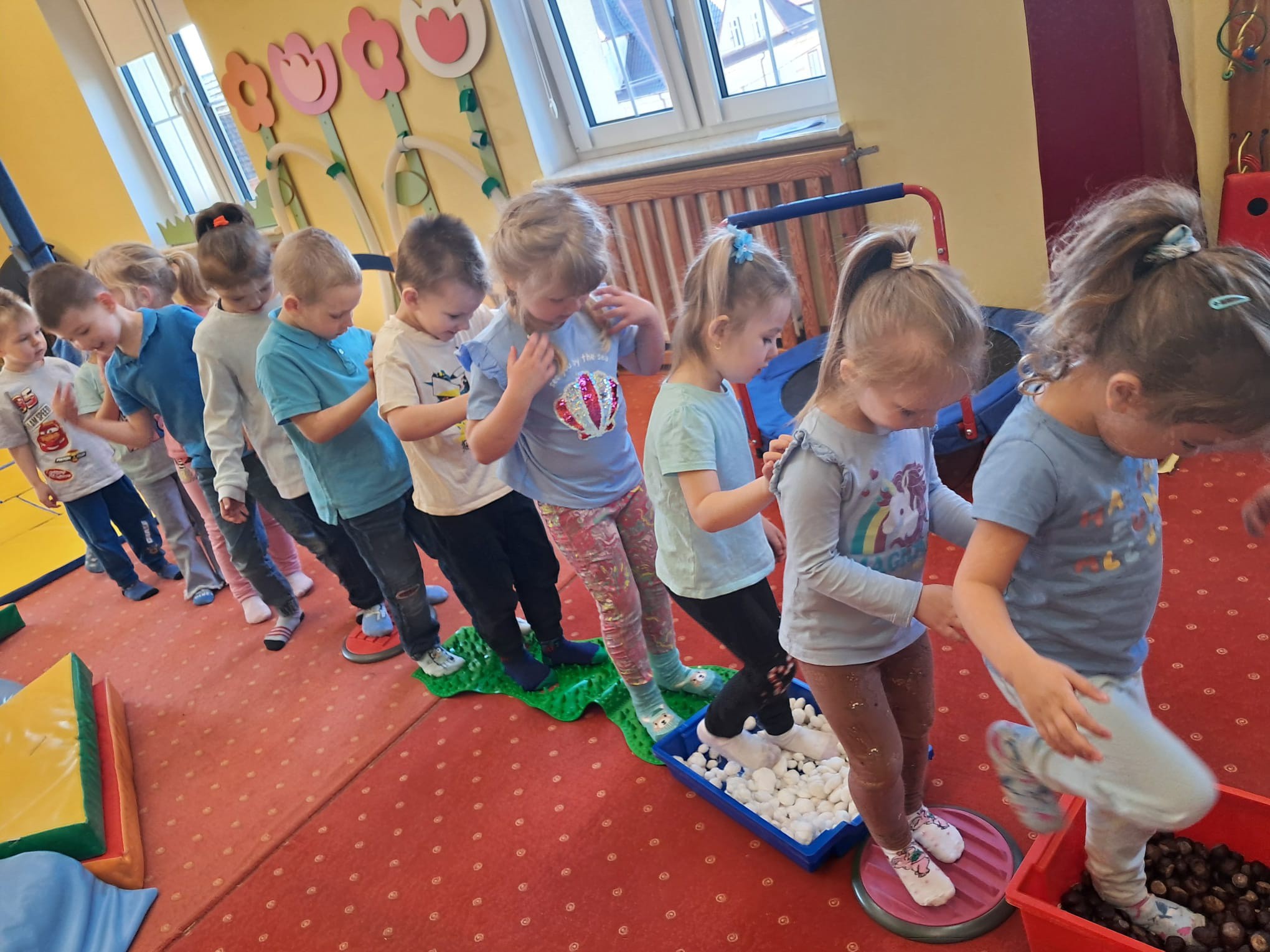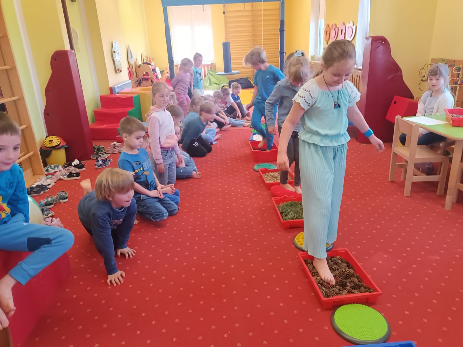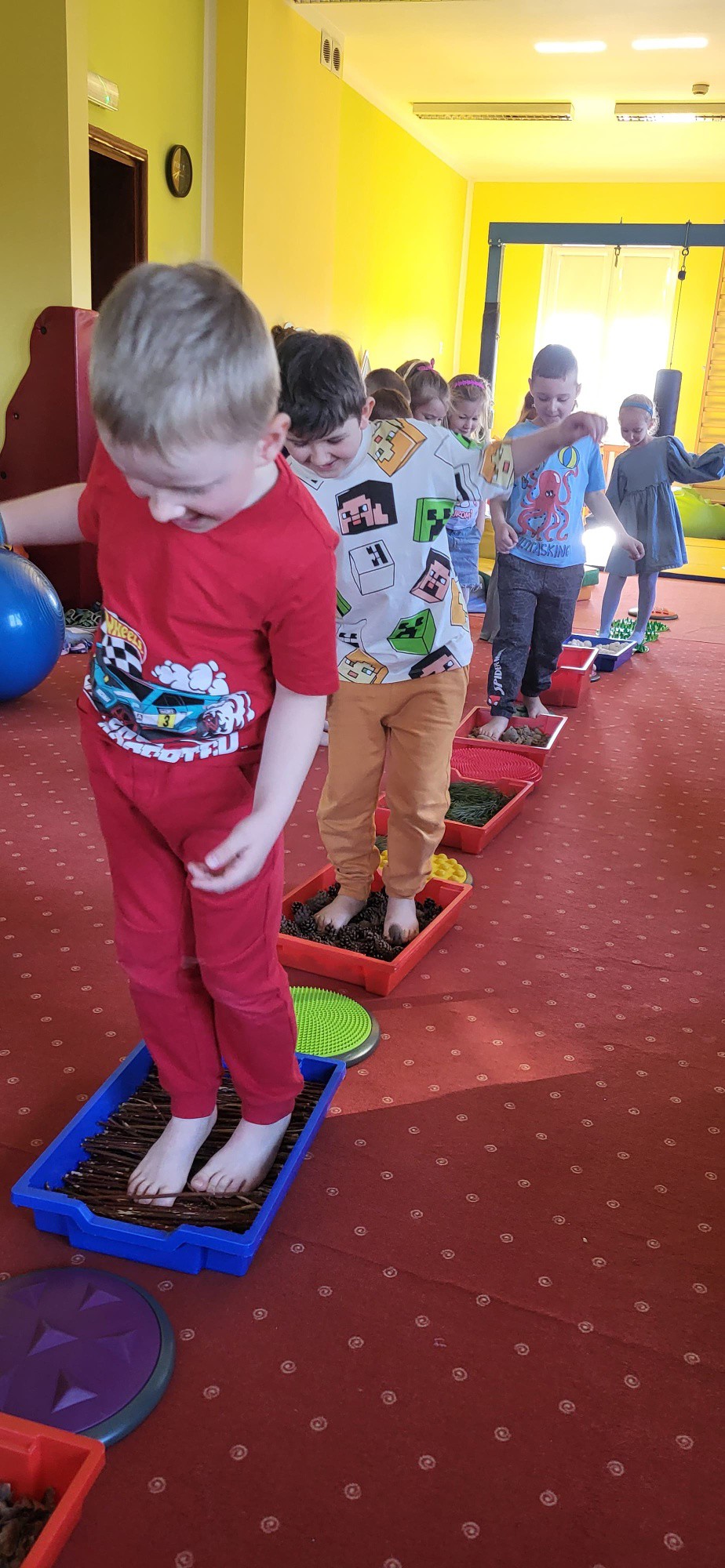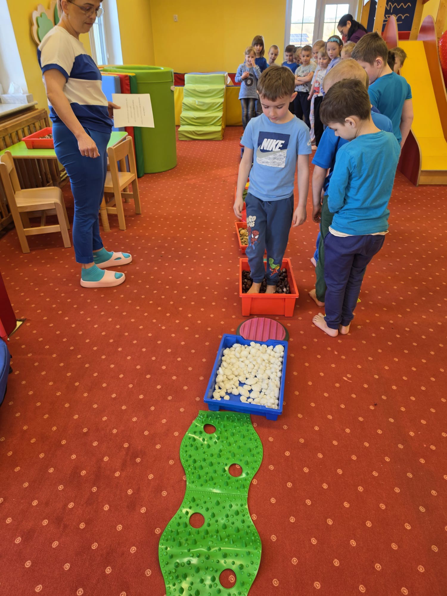 Kolorowanie niedominującą ręką oraz spacer po ścieżce sensorycznej.
