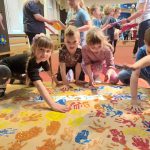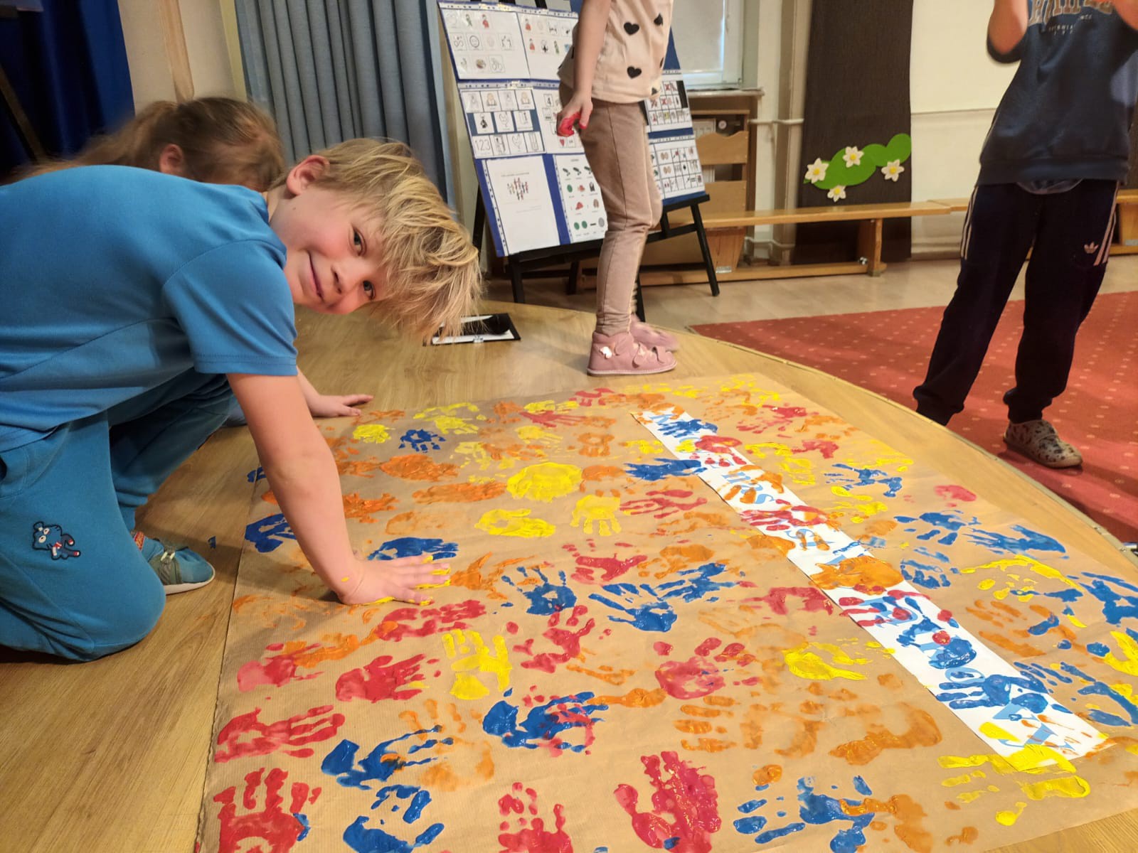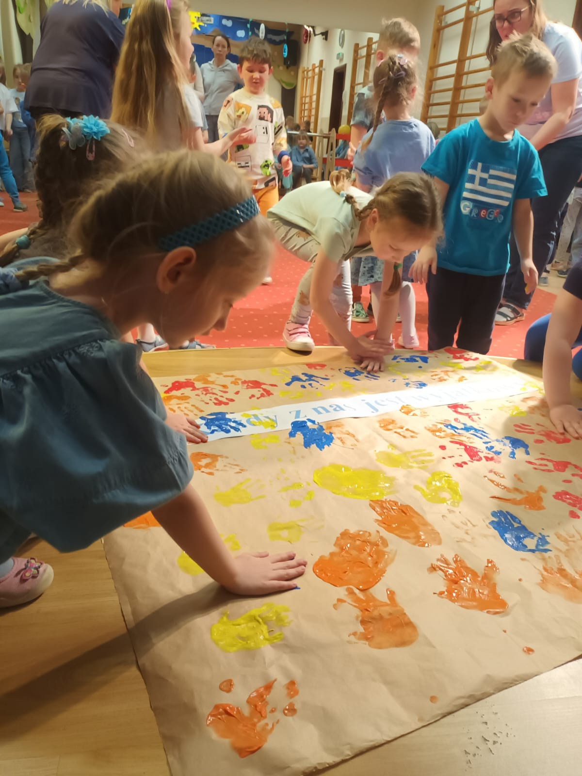 Na koniec, bogatsi o nowe doświadczenia, stworzyliśmy wspólne dzieło. Każdy przedszkolak odbił swoją dłoń na wielkim plakacie pod hasłem:
